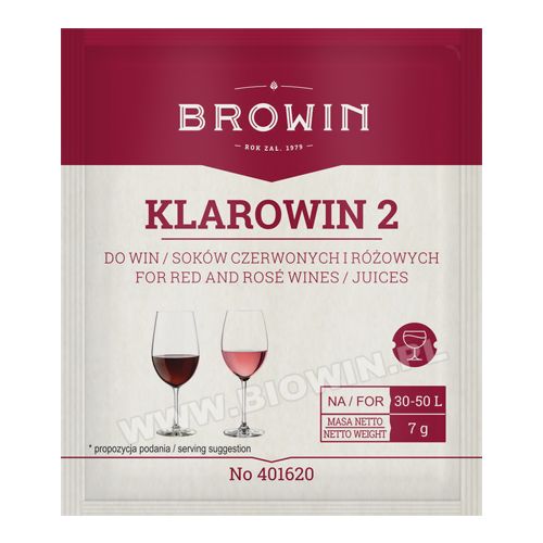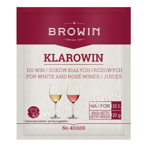 Klarowin skuteczny środek w postaci proszku do klarowania win i soków. Po napęcznieniu w wodzie wykazuje silne właściwości adsorpcyjne. Wiąże w swej strukturze różnego typu substancje, głównie białka, powodując ich osadzanie na dnie naczynia. Stosowany głównie do win białych i różowych, w przypadku wysoko garbnikowych należy przeprowadzić wstępne próby czy nie odbarwi płynu. Opakowanie 10 g Klarowinu wystarcza na sklarowanie 10 l płynu.
